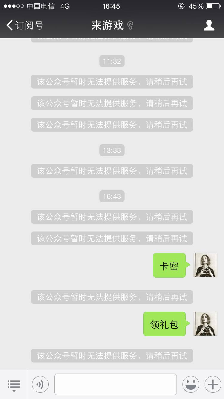 大家在来游戏的微信公众平台发布消息时,应该也都收到“无法提供服务”
